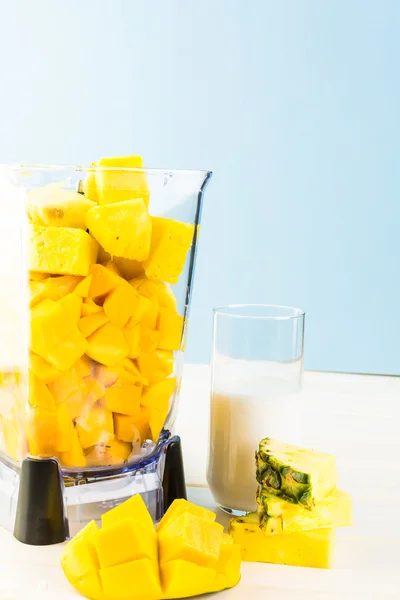 Gọt xoài và cắt thành miếng nhỏ. Cho xoài, nước cốt dừa, mật ong và đá vào máy xay sinh tố. Xay nhuyễn đến khi hỗn hợp mịn và đồng